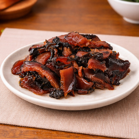 甘辛く炊いた椎茸とツンと香る葉わさびが絶妙にマッチした一品。噛むたびに椎茸のジュワッと染み出す旨味が広がり、そのあとにほんのりと鼻を抜けるわさびの香りがアクセントになっています。ご飯に乗せても、酒の肴にしても、味わい深い美味しさが楽しめます。