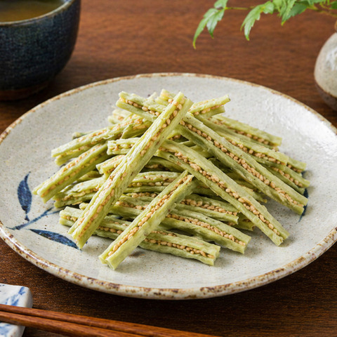 たらのすり身をシートにして香り高い胡麻をサンドしました。ちょっぴりわさびのツーンとした辛さが癖になる味です。