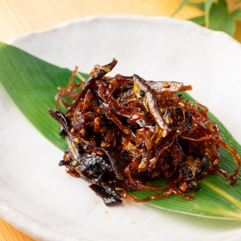 いか、ちりめん、いわし、短冊昆布を甘口に炊き上げました。 ごまの風味がさらに食欲をかき立てます。