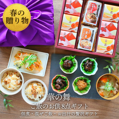 華の舞 【ご飯のお供ギフト8点入り】(黒舞昆・たもぎ茸舞昆・極旨松茸舞昆・粒生姜舞昆・舞昆旨だし・丹波地鶏混ぜご飯の素・生姜まぜご飯の素) 4,980円 -
